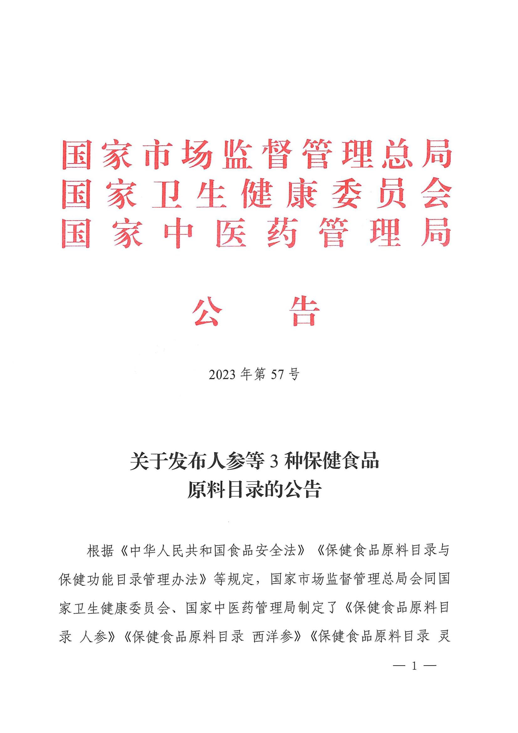 根据《中华人民共和国食品安全法》《保健食品原料目录与保健功能目录管理办法》等规定,国家市场监督管理总局会同国家卫生健康委员会、国家中医药管理局制定了《保健食品原料目录人参》《保健食品原料目录西洋参》《保健食品原料目录灵芝》,现予发布,自 2024 年 5 月 1 日起施行。