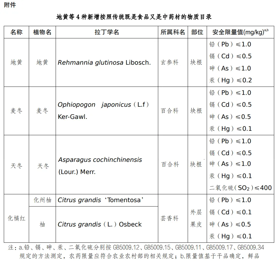 根据《中华人民共和国食品安全法》及其实施条例、《按照传统既是食品又是中药材的物质目录管理规定》,经安全性评估,现将地黄、麦冬、天冬、化橘红等 4 种物质纳入按照传统既是食品又是中药材的物质目录。